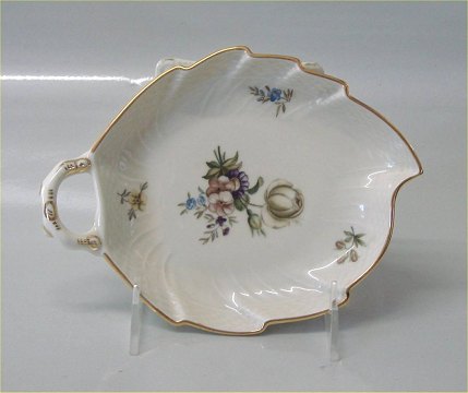 Royal Copenhagen Frijsenborg 1868-910 Bladformet asiet 18,5 x 13,5 cm. Blomstermotiver på svejfet stel med guldkant.
