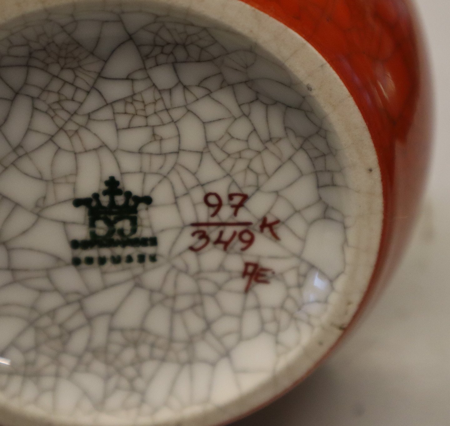 Beskrivelse: 097-349 Dj Vase Rød med blomst på grå og med guld kant 14 x 14 cm Dahl Jensen. Mærket med kongelig krone og DJ Copenhagen i hel og fin stand. Craquelé, Craquele, Krakelé eller Krakkele (Crackelure)