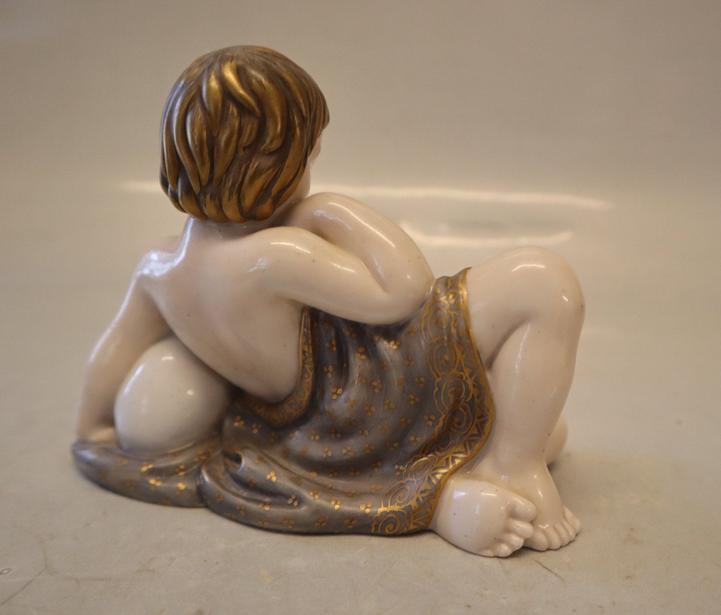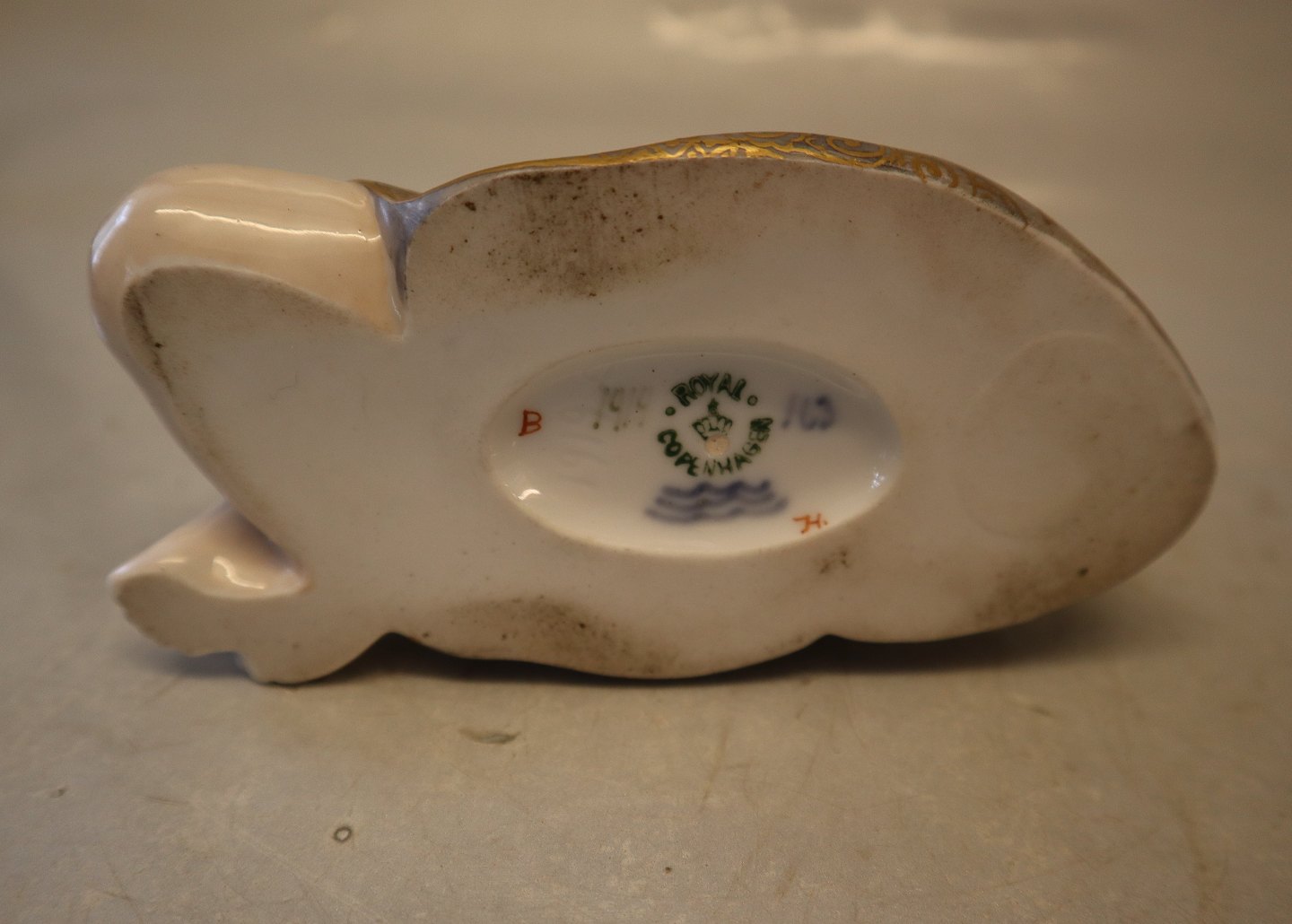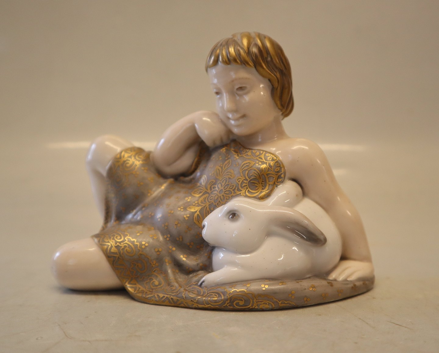Beskrivelse: 1919 Kgl. Liggende pige med kanin 11 x 14 cm Michael Pedersen præ 1923 (1913 - 1918) figur fra Royal Copenhagen I hel og fin stand