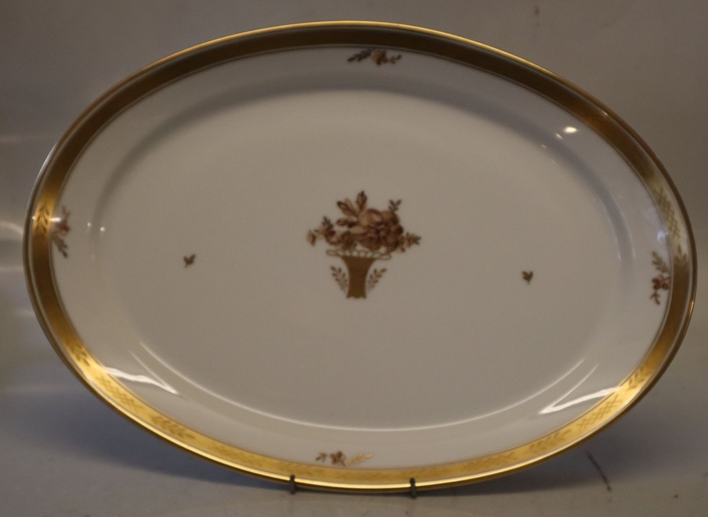 Kgl. 9009-595 Ovalt stegefad 37 cm Royal Copenhagen Guld dekoration på hvidt porcelæn 1927. I hel og fin brugt stand Golden Basket