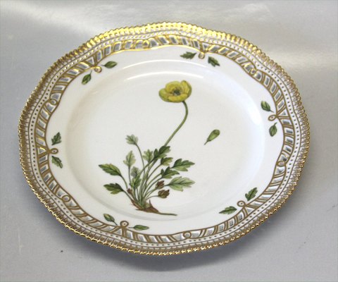 Beskrivelse: Royal Copenhagen Flora Danica 20- 3554-3533 "Papaver Nudiaule L" Fad til lille rund frugtkurv, flad tallerken med gennemskåret bort (1969) 23 cm Blomstermotiver på guldbelagt perlestel. 1. sortering i fin og hel stand