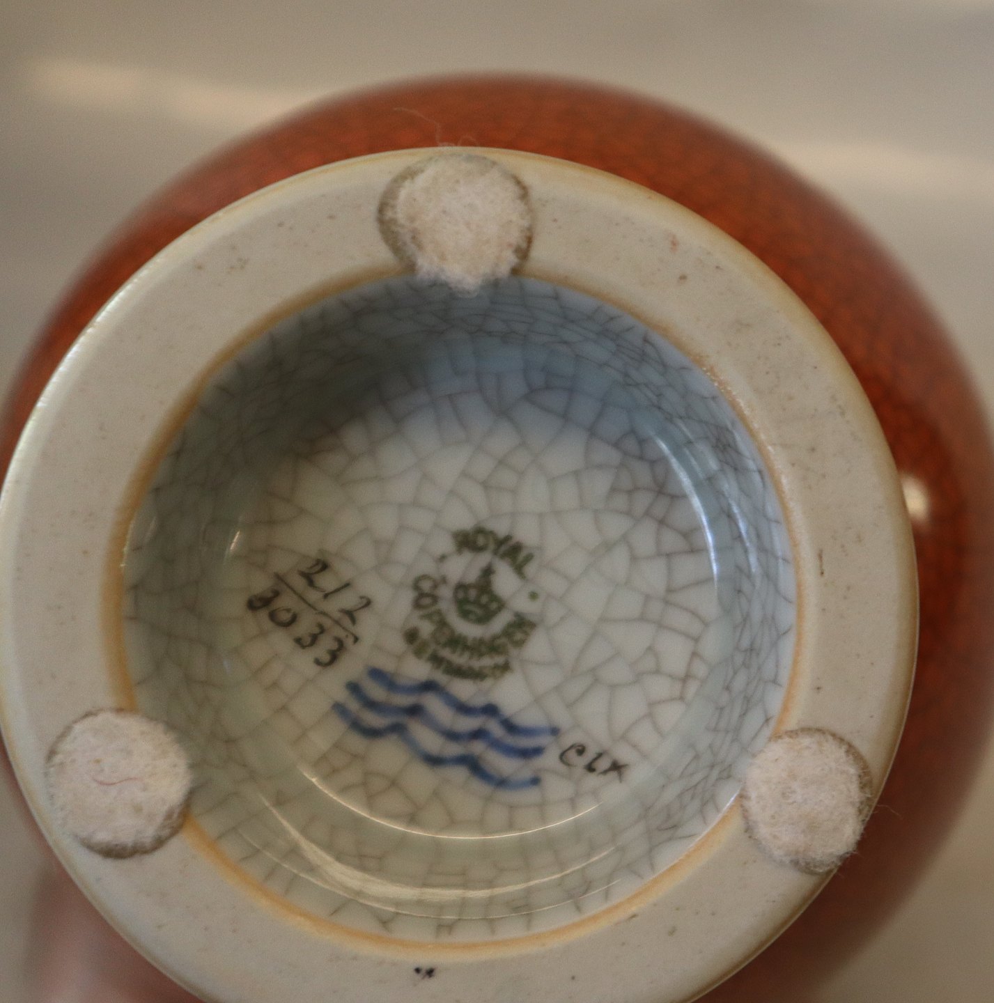 Beskrivelse: 212-3033 Kgl. Vase 15 cm Orange, graa og guld Kgl. Craquelé fra Royal Copenhagen I hel og fin stand