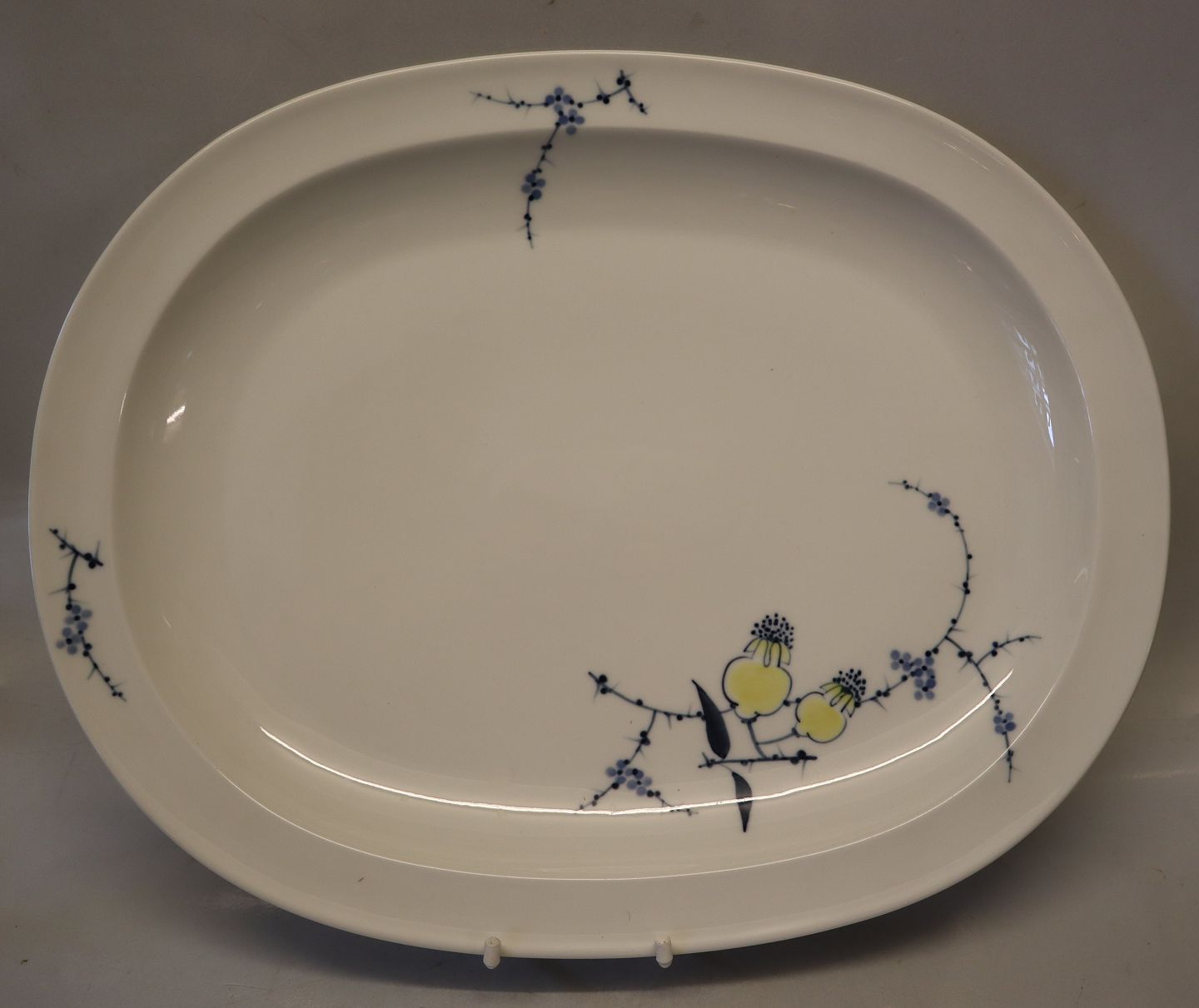 46-14826 Stort fad 32 x 40.5 cm Royal Copenhagen Rimmon Design Johannes Hedegaard. I produktion fra 1967 - 1977. Rimmon er hebræisk for granatæble. Hvidt porcelæn med gul og blå håndmalede grene. Royal Copenhagen spise - og kaffestel