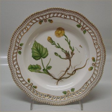 Kongelig Dansk Porcelæn Flora Danica 20-3553 Fussilago Farfara L Fad til stor rund frugtkurv, flad tallerken med gennemskåret bort 25 cm