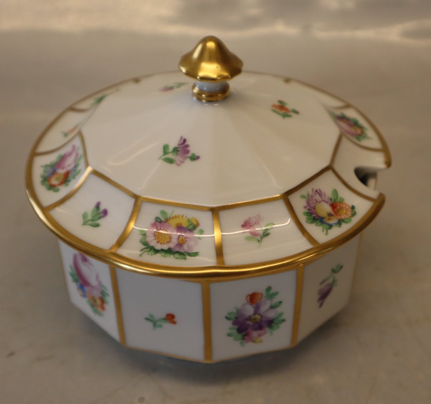 8572-444 Marmeladeskål med hul til ske 11 x 13 cm Kgl. Henriette # 444 Håndmalet spise- og kaffestel fra Den kongelige Porcelænsfabrik med strøblomster . I fin og hel stand