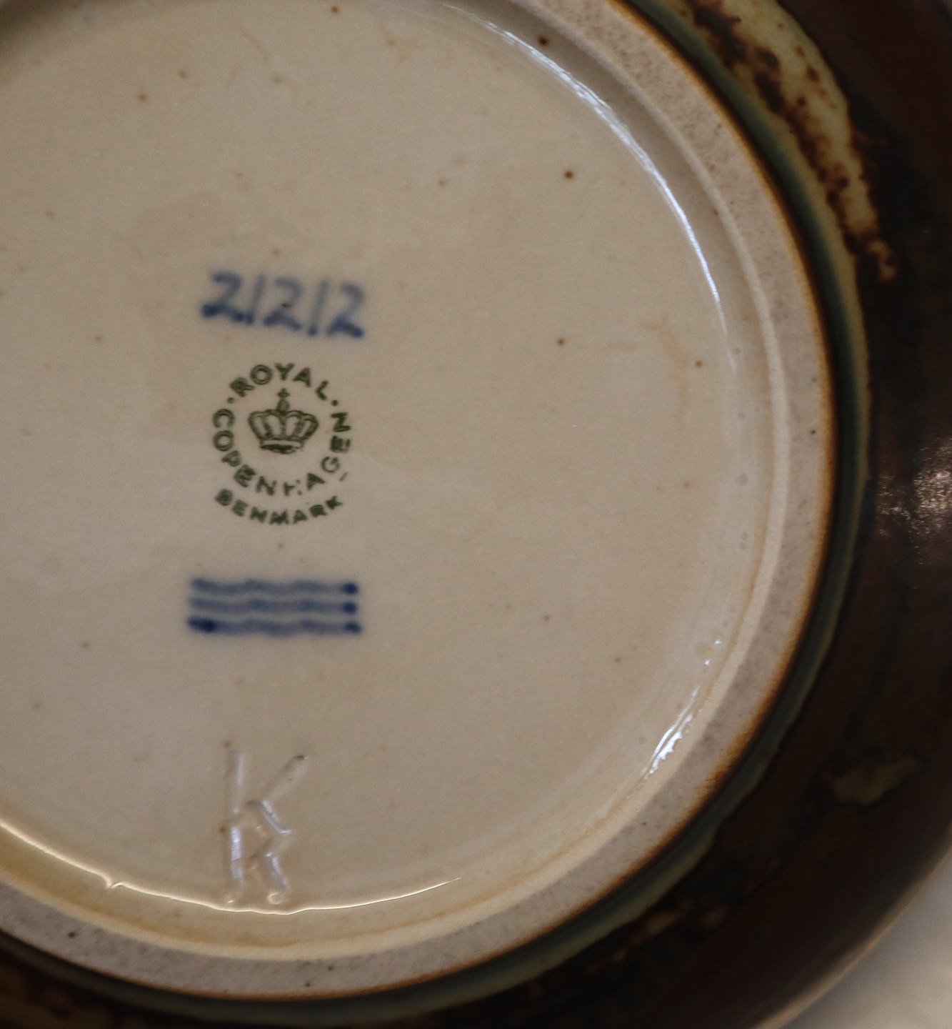 Beskrivelse: 21212 Kgl. Skål med edderfugle 18.5 cm, KK, april 1954 Knud Kyn Royal Copenhagen stentøj I fin og hel stand