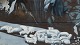 Beskrivelse: Anders Ova 2003: Får ved fjeldside. Akryl på pap? i sølvramme 66 x 55.5 cm