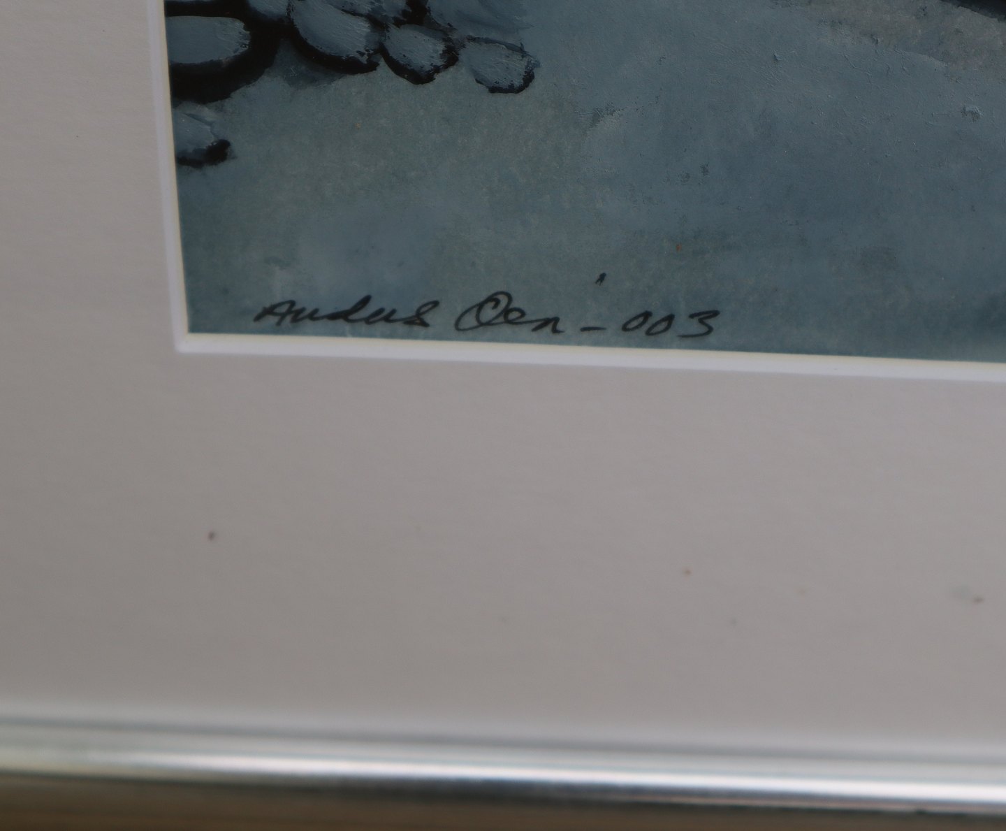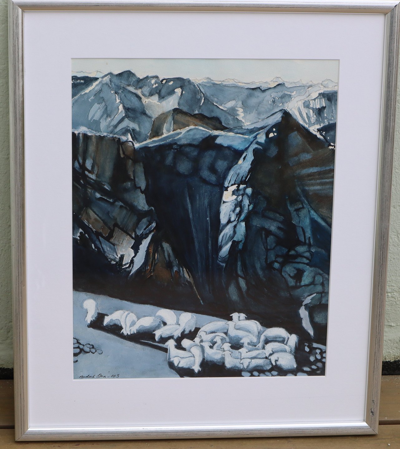 Anders Ova Maleri 2003: Får ved fjeldside. Acryl på pap i sølvramme 66 x 55.5 cm