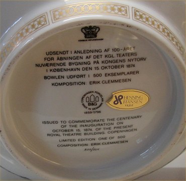 Beskrivelse: Bing & Grøndahl Teaterbowle Udsendt i anledning af 100-året for åbningen af det Kgl. Teaters nuværende bygning på Kongens Nytorv i København den 15. oktober 1874. Bowlen er udført i 500 eksemplarer Komposition: Erik Clemmesen (1905-1984) I fin og hel stand.