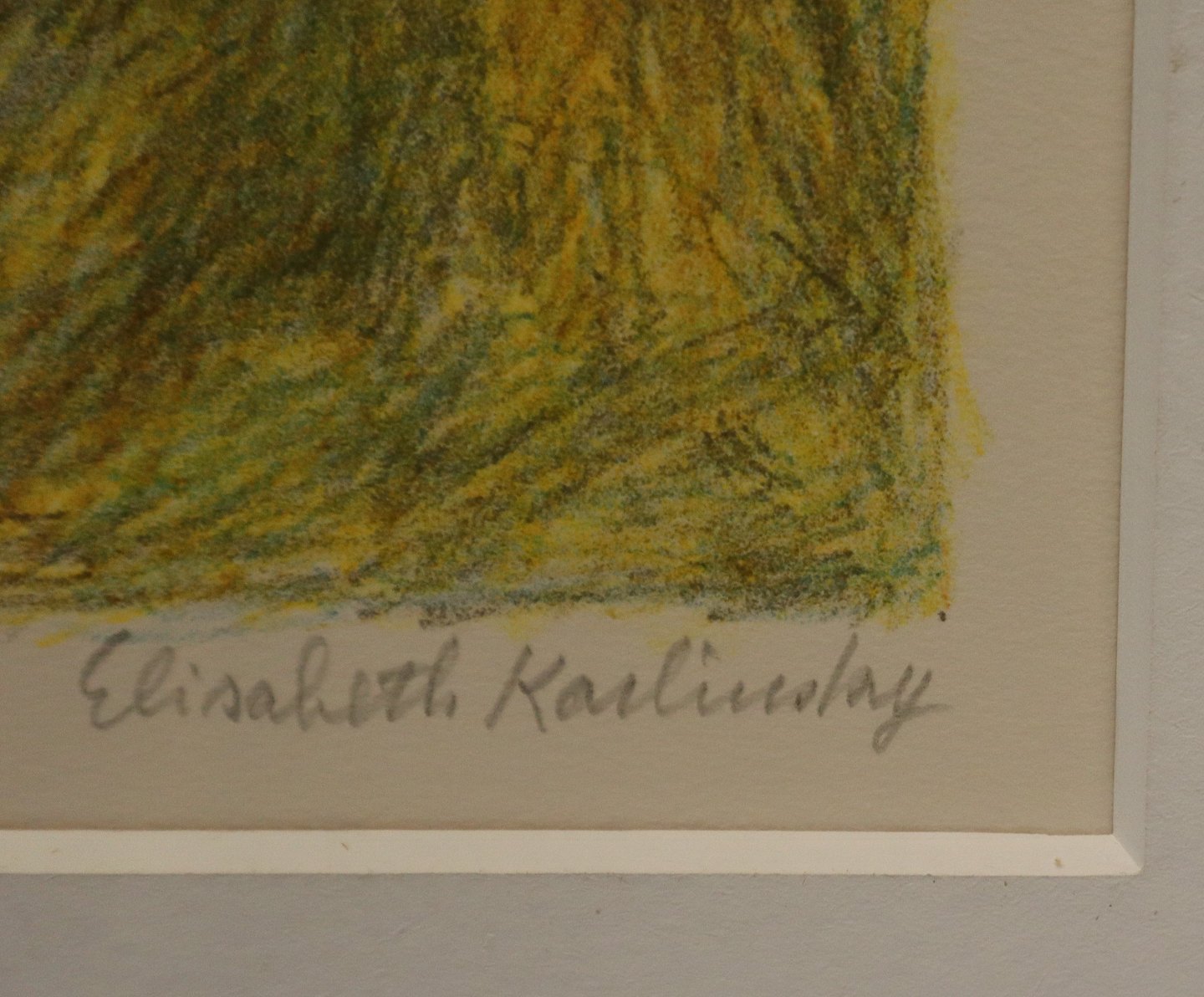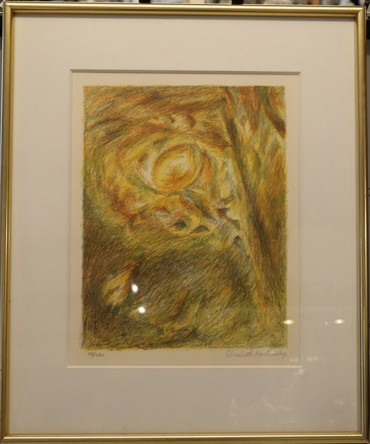 Beskrivelse: Elisabeth Karlinsky Lithografi i glas og guldramme ca 43.6 x 44.5 cm nummer 48 af 280 Lysmål ca 32.5 x 25 cm Signeret