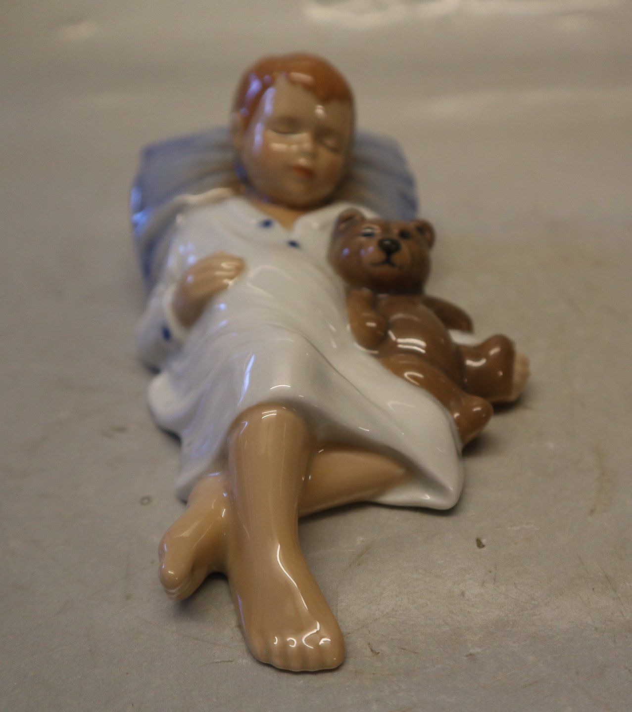 Beskrivelse: 0681 Kgl. Jens sovende, Dreng sover med bamse, 6 x 11 cm (1021681) Allan Therkelsen Porcelæn fra Royal Copenhagen I hel og fin stand