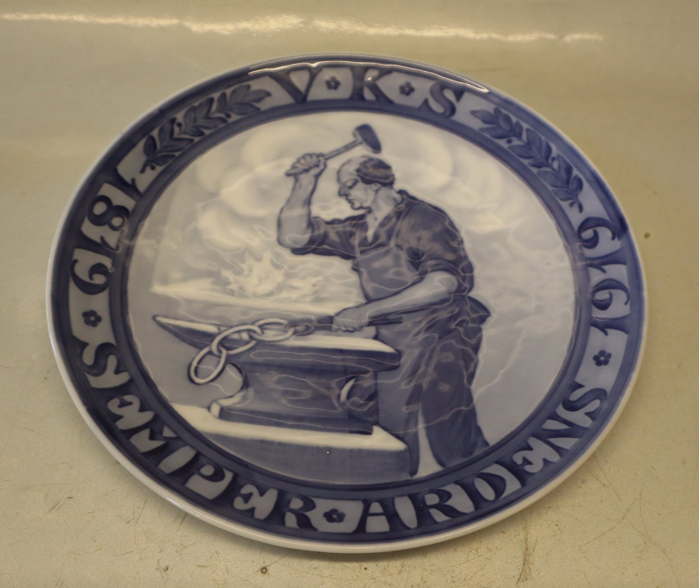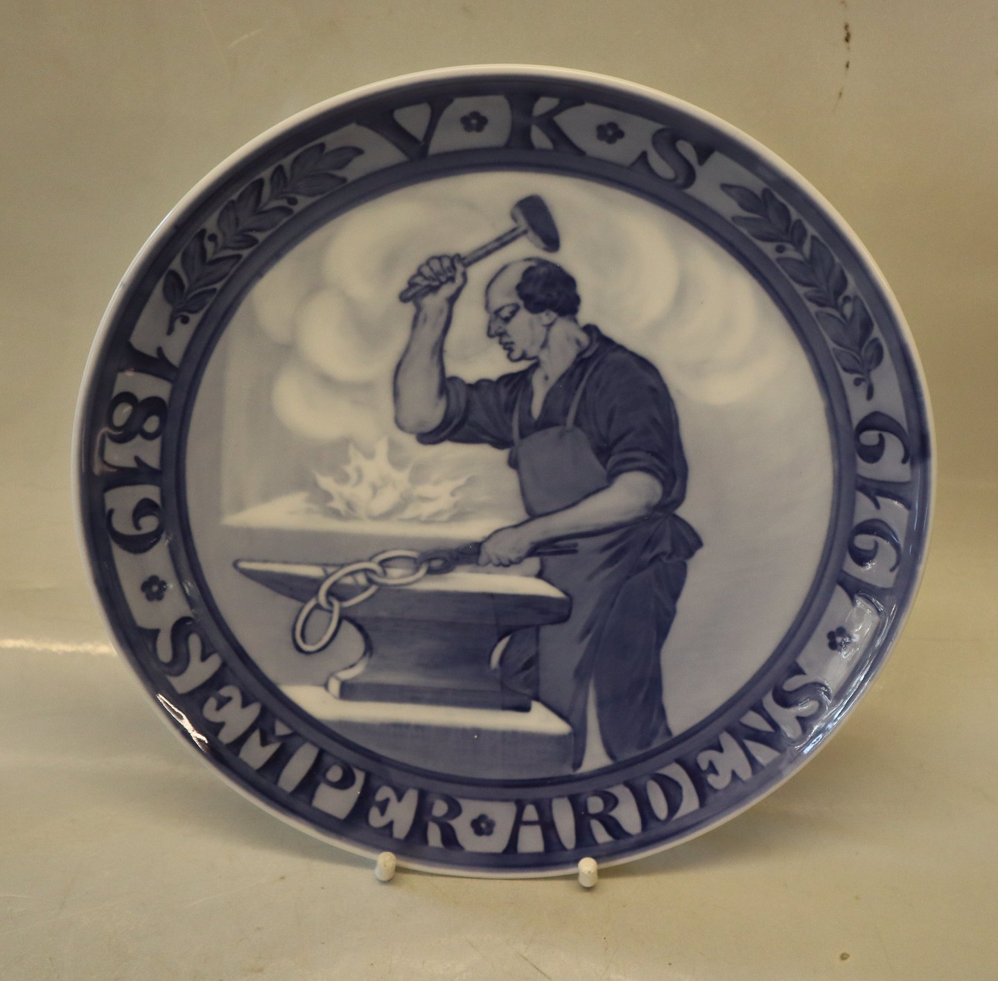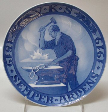 Beskrivelse: Smed, der smeder Odd Fellow Ordenens tre ringe. Indskrift: SEMPER ARDENS (altid brændende) V.K.S. 1819-1919. Mindeplatte bestilt af den uafhængige Orden Odd Fellows. Designet af Christian Thomsen. Udgivet 1500 eksemplarer. 23 cm