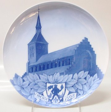 Beskrivelse: RC-CM82 1907: Odense – platte. Skt. Knuds kirke set fra sydøst. F.n. bladværk med byvåben og indskrift: ODENSE 1908. Design: Arnold Krog 212 ekspl., 11”, 28 cm Royal Copenhagen mindeplatter også kaldet lejlighedsplatter fremstillet til særlige lejligheder eller på bestilling. Dem kongelige porcelænsfabrik har fremstillet over 500 forskellige.