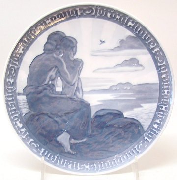 Beskrivelse: Kongelig Dansk Mindeplatte #186 Fredsplatte. Mor og søn ser mod opgående sol. Indskrift: FOR ANDEN GANG JORD AF HAVET GRØN OG HERLIG SER OPSTIGE – VØLVENS SPAADOM (fra den ældre Edda).