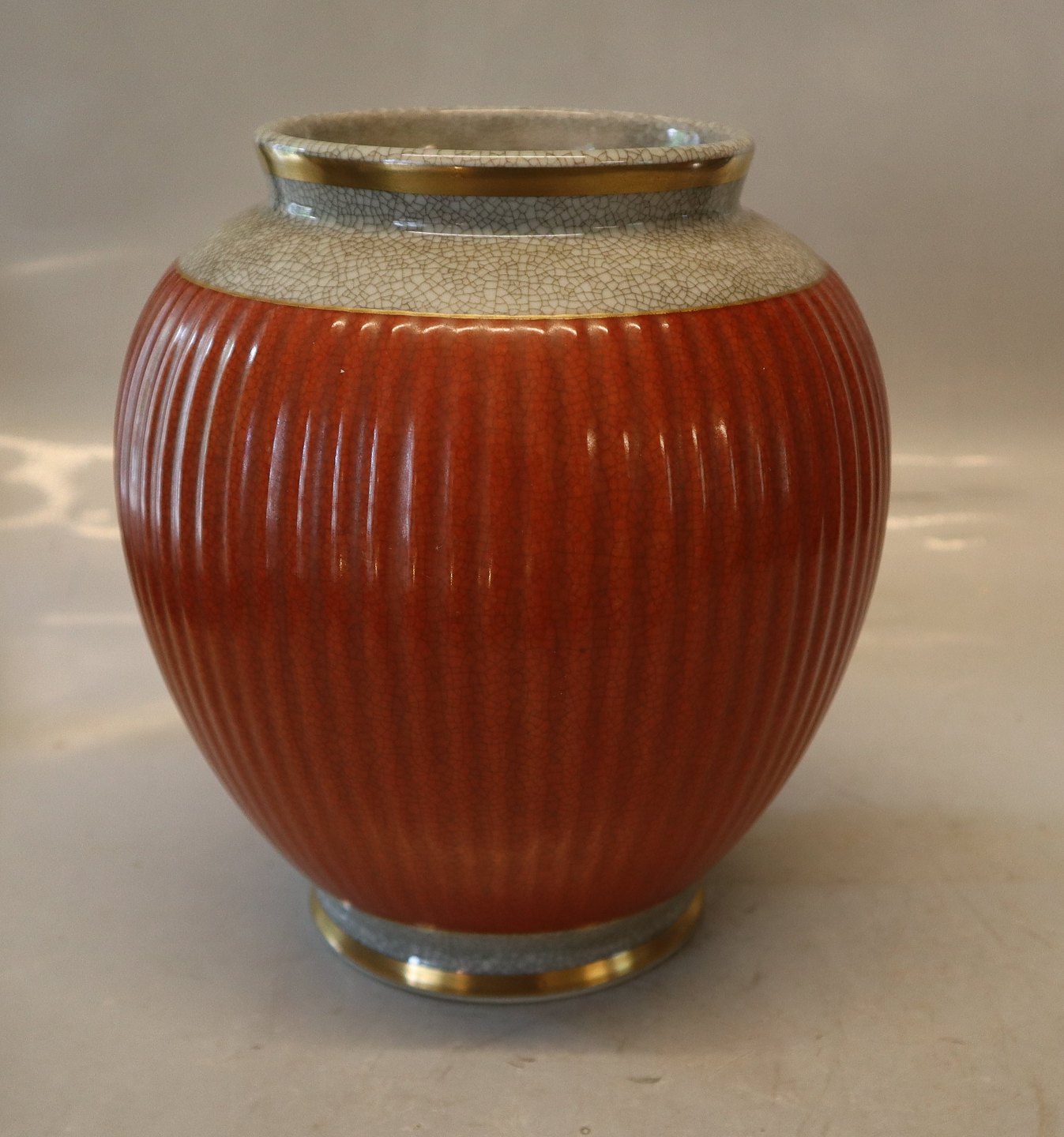 Beskrivelse: 212-2781 Kgl. Lågkrukke med gråt, orange og guld 25 cm Lågvase Craquelé fra Royal Copenhagen I hel og fin stand Urne