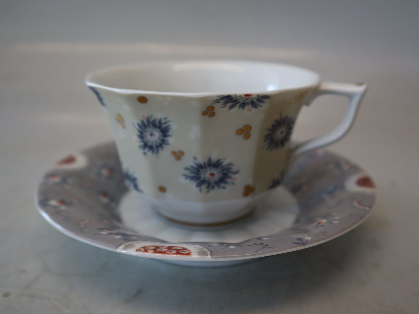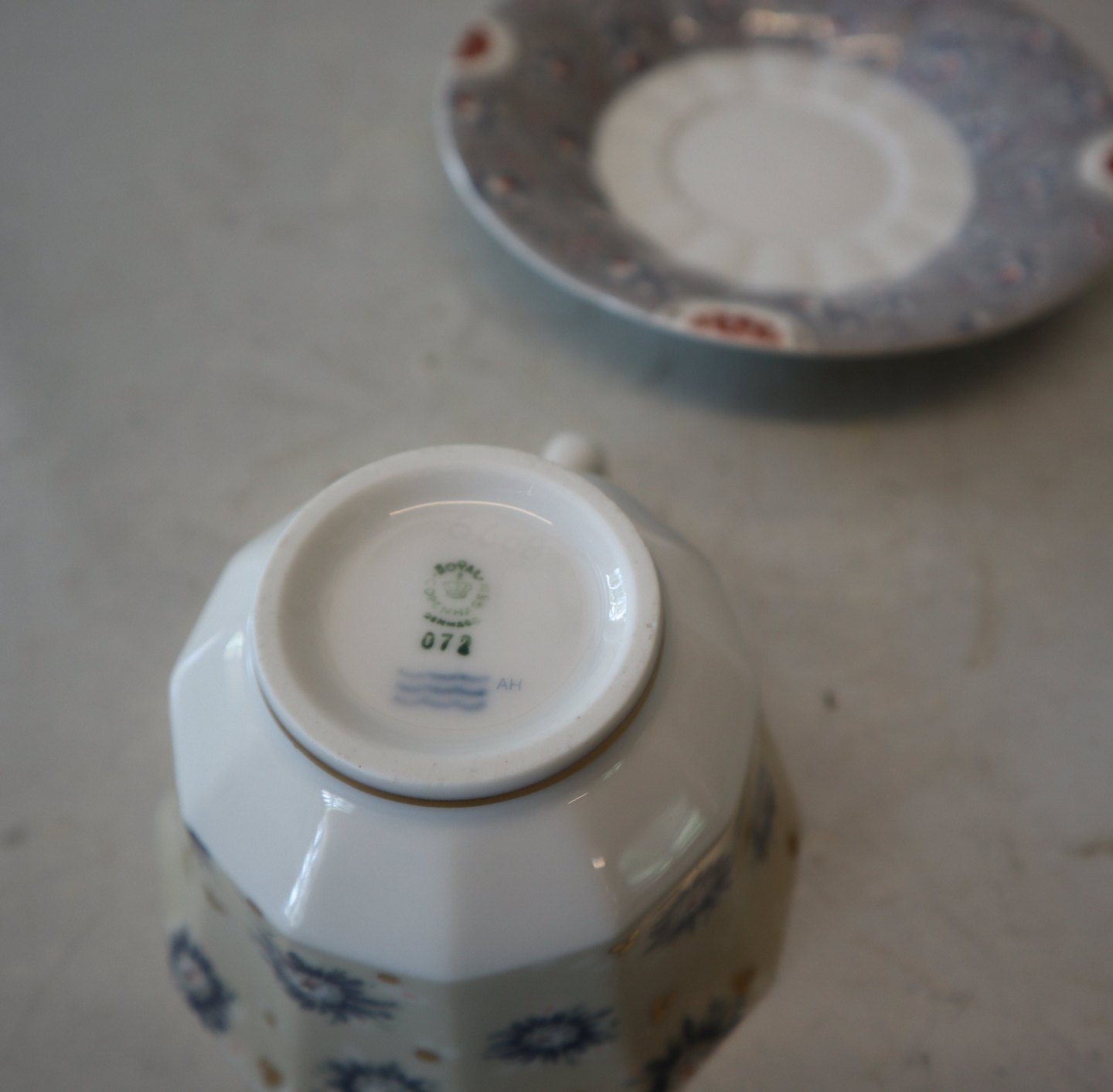 072 Kaffekop 15 cl og underkop 073 13,7 cm (8608) . Royal Copenhagen Fairytale. Inspireret af Gerhard Hennings figurer af samme navn. Et kompleks flerfarvet transfer mønster på den kantede form som Blå Blomst Kantet. Design Finn Næss-Schmidt og Jørgen Nielsen. De grå dele har nummer 1201, terrakotta 1202 og serveringsdele med lidt af hvert 1203.