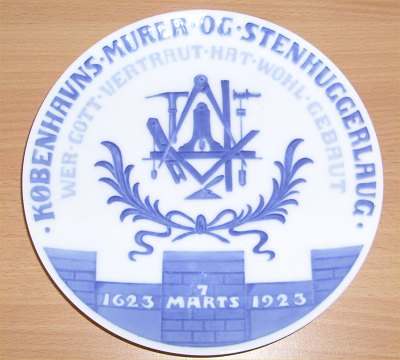 Title / Danish: Murerlavets platte. Murværk, derover værktøj. Indskrift: KØBENHAVNS MURER OG STENHUGGERLAUG WER GOTT VERTRAUT HAT WOHL GEBAUT 1623 – 7 MARTS – 1923. Lavets 300 års jubilæum.