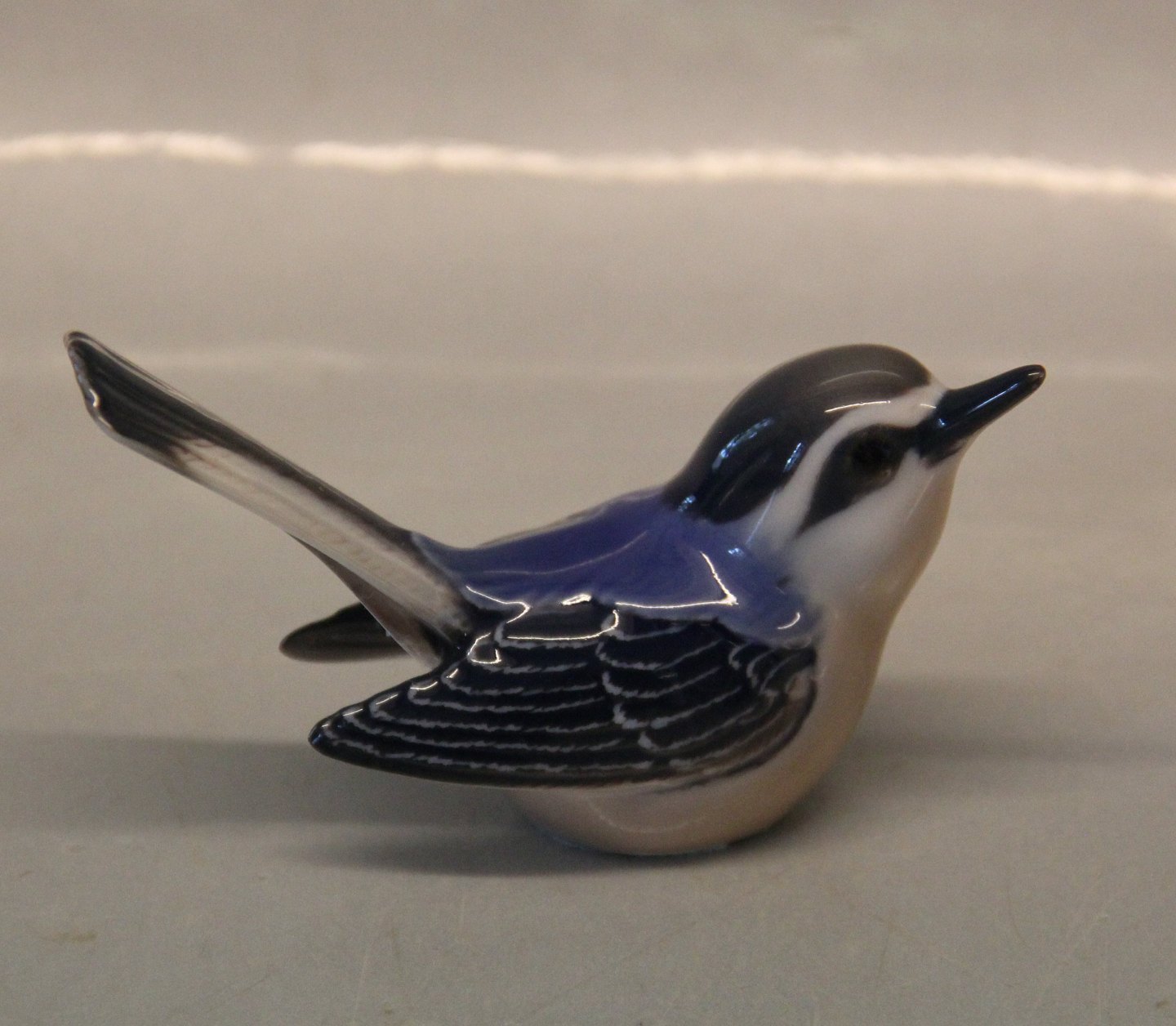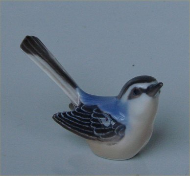 Beskrivelse: Dahl Jensen Fuglefigur 1348 Myggesnapper 9 cm (DJ). Mærket med kongelig krone og DJ Copenhagen i hel og fin stand.