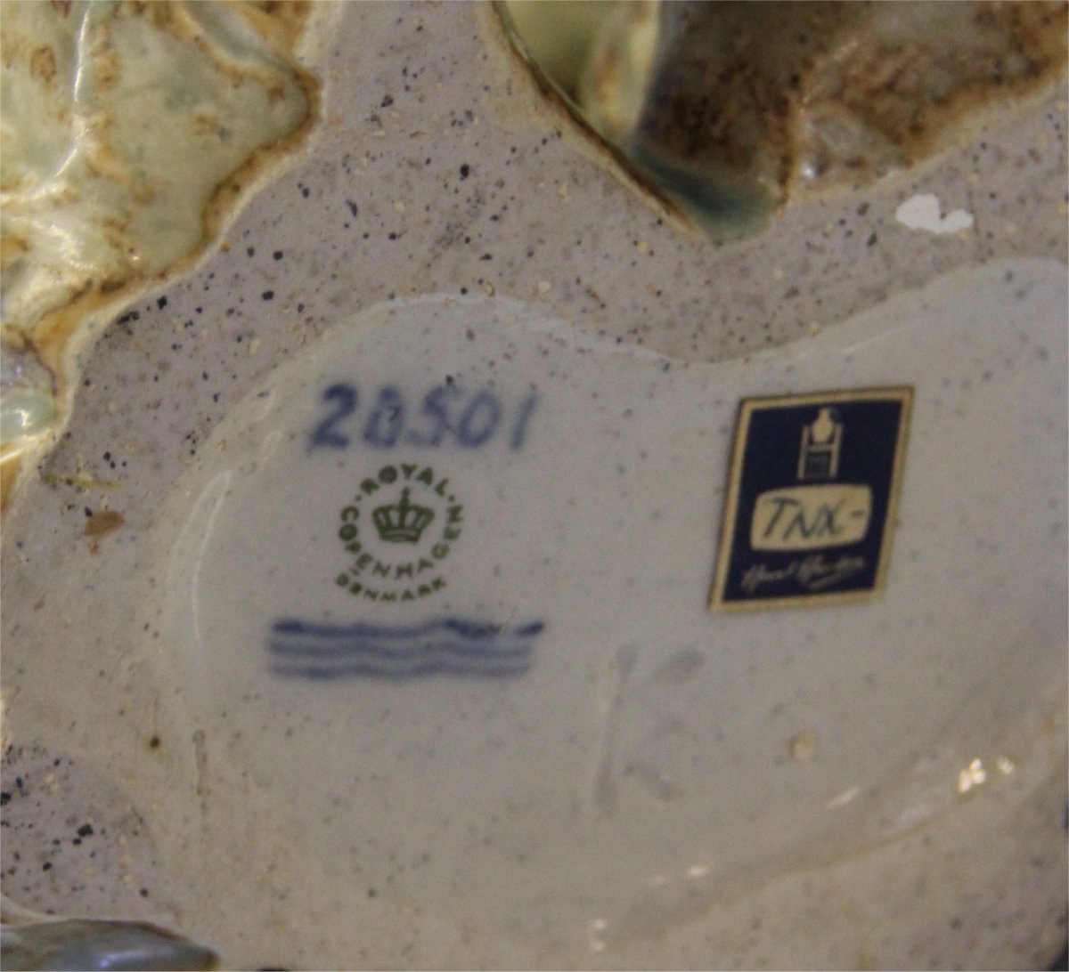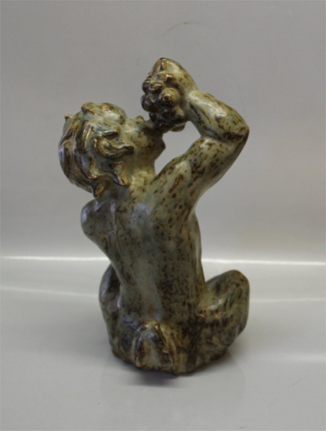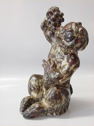 Beskrivelse: Royal Copenhagen stentøj 20501 RC Pan med druer Knud Kyhn, marts 1942 35 cm I fin og hel stand. Faun Bacchus