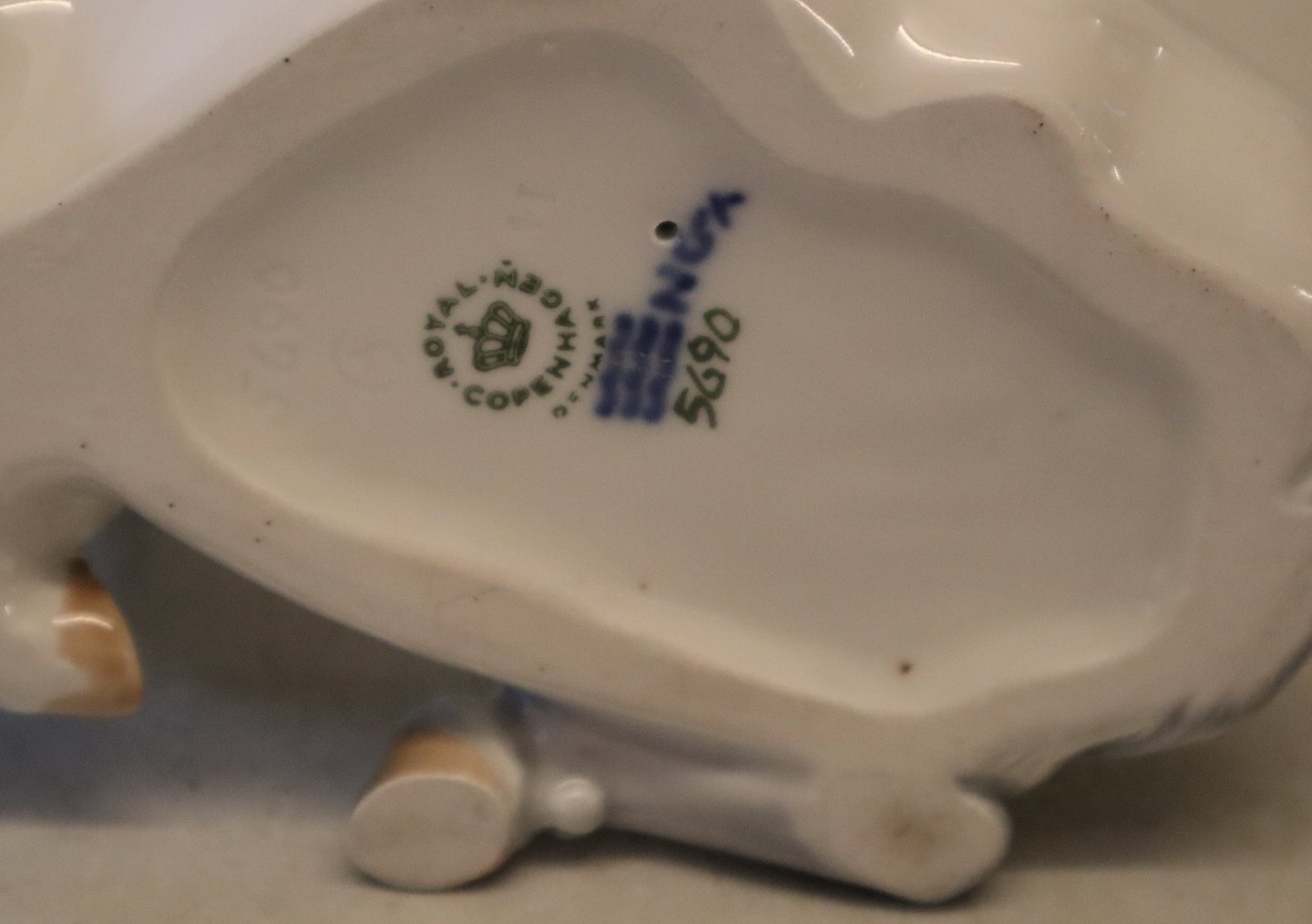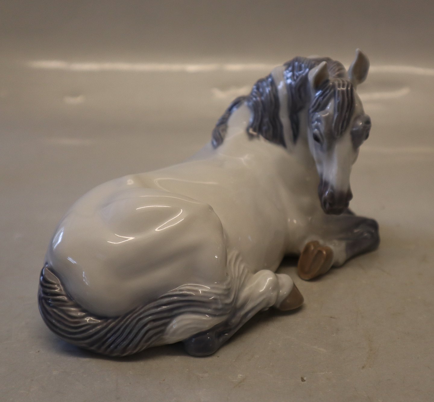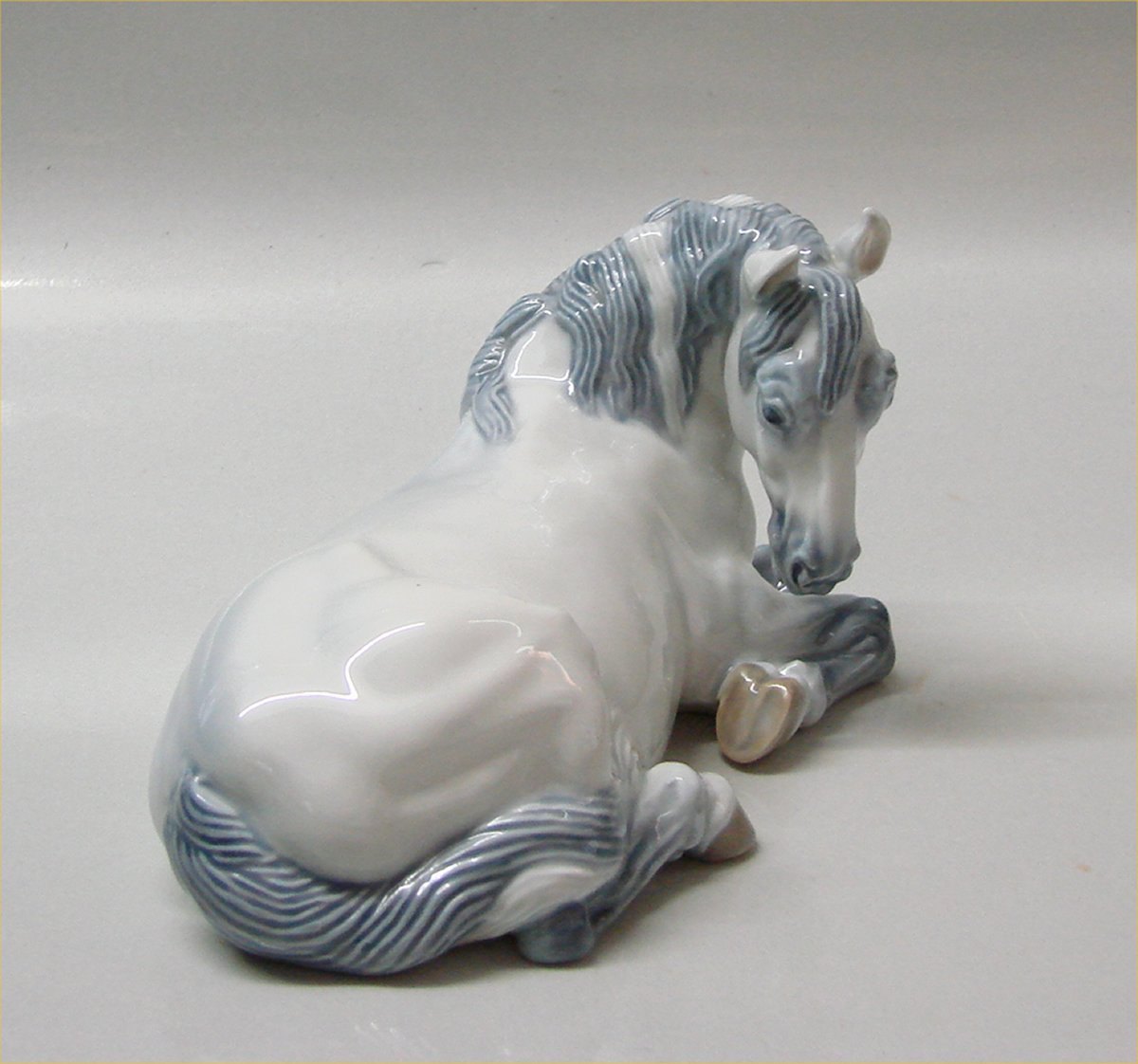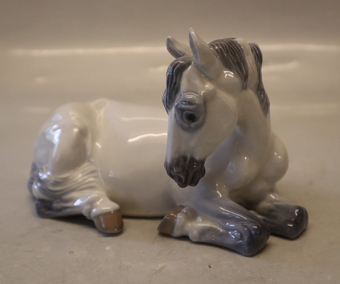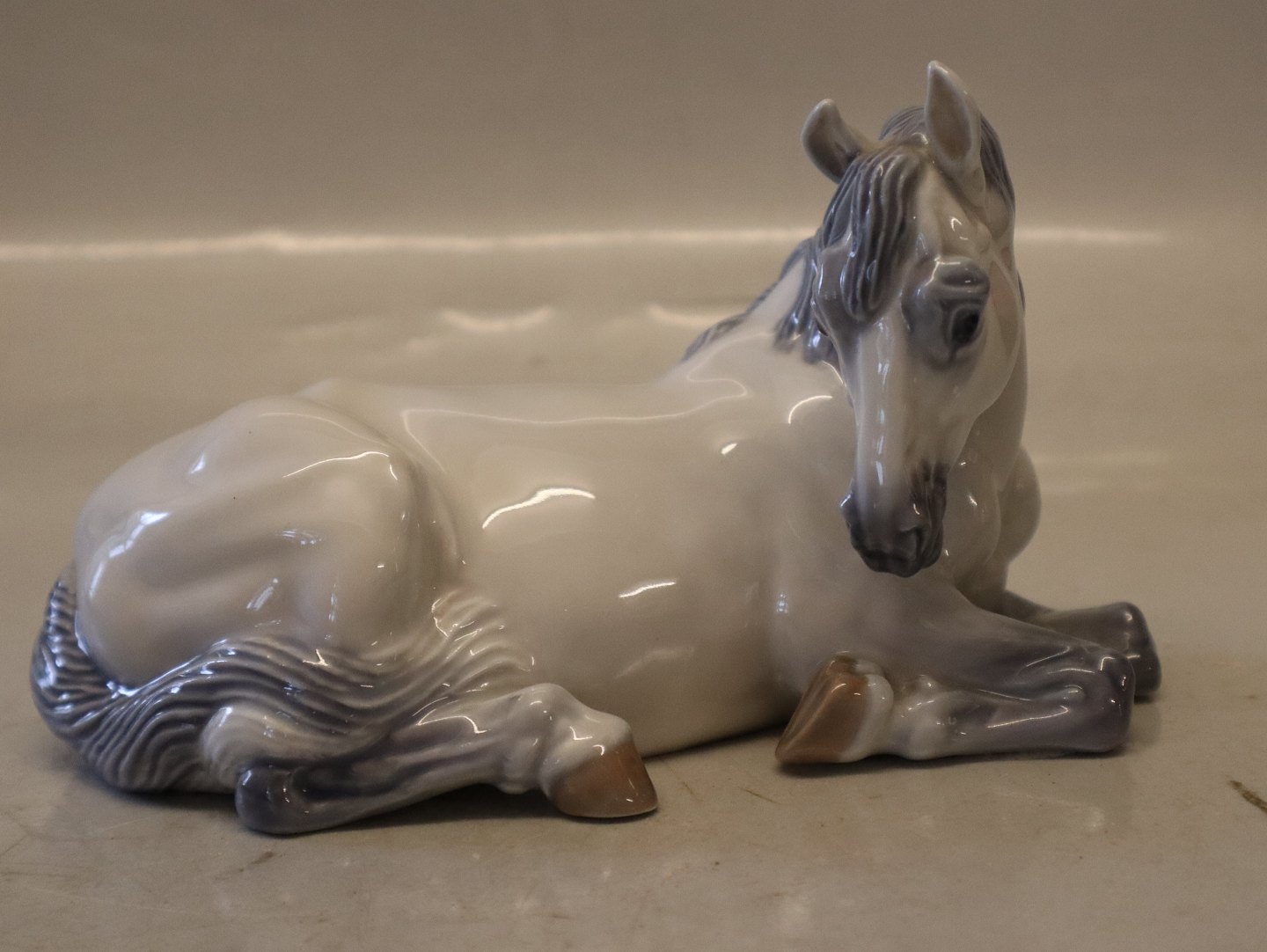 Beskrivelse: Kgl. hestefigur fra Royal Copenhagen 5690 liggende hoppe 10.5 x 18.5 cm 2. I hel og fin stand Jeanne Grut