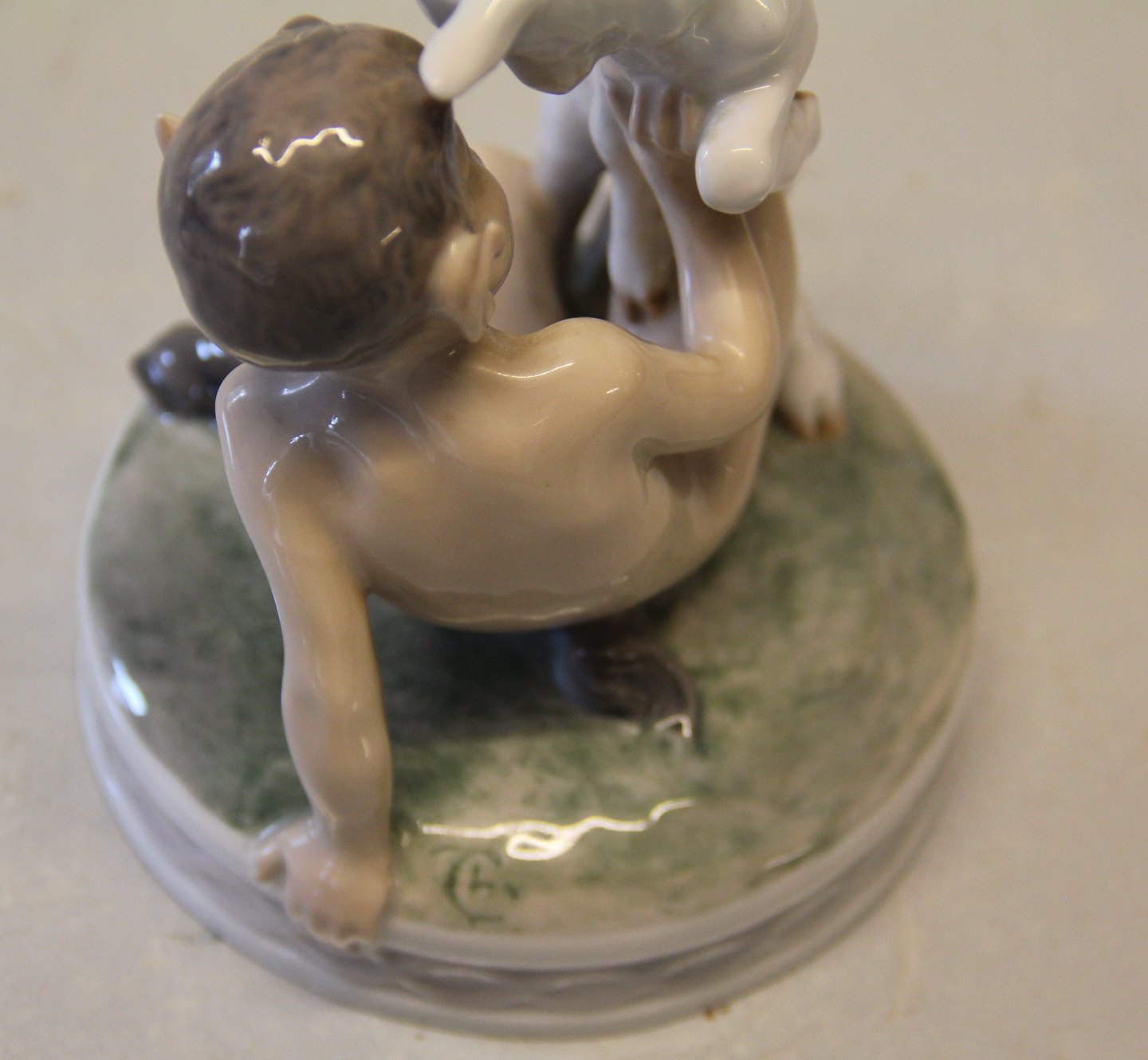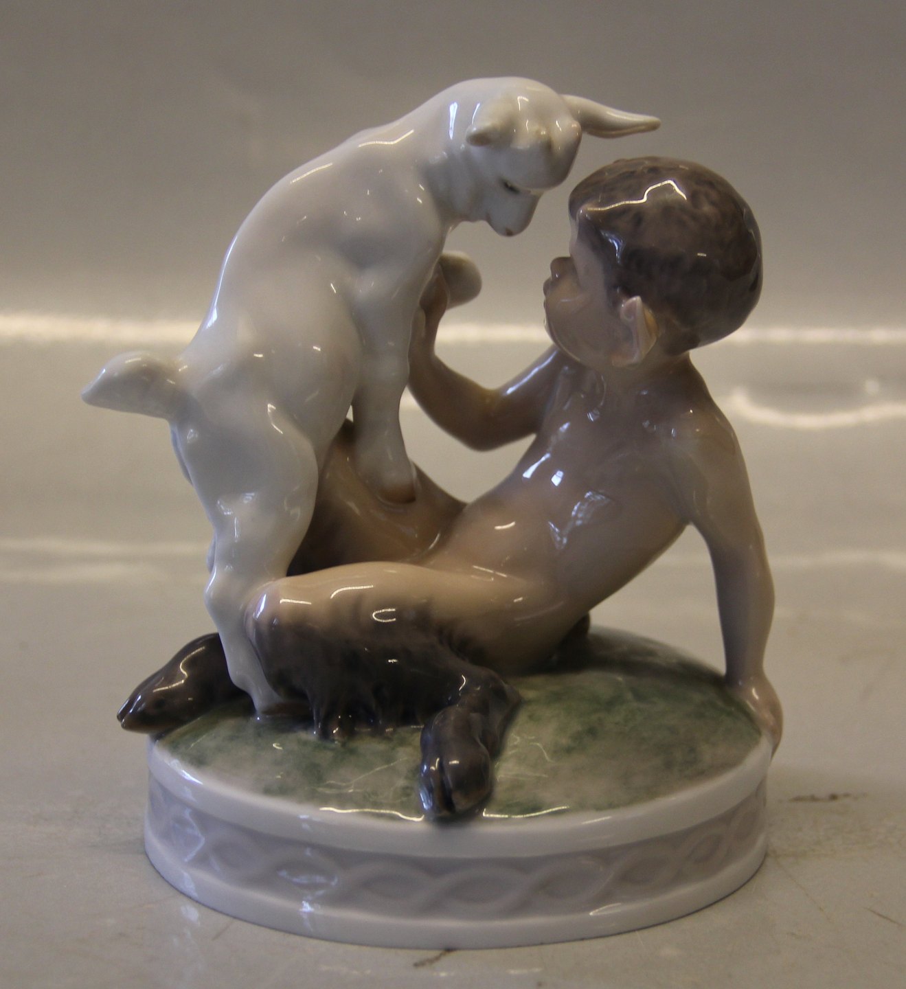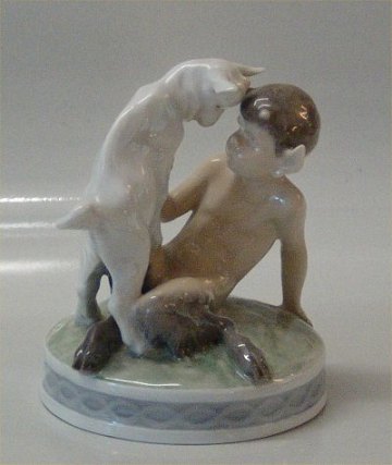 Beskrivelse: Kgl. figur fra Royal Copenhagen 0498 Kgl. Faun med gedekid 3.5 x 11 cm. Chr. Thomsen 1906 (498-1012) I hel og fin stand Pan Puk 1012-498