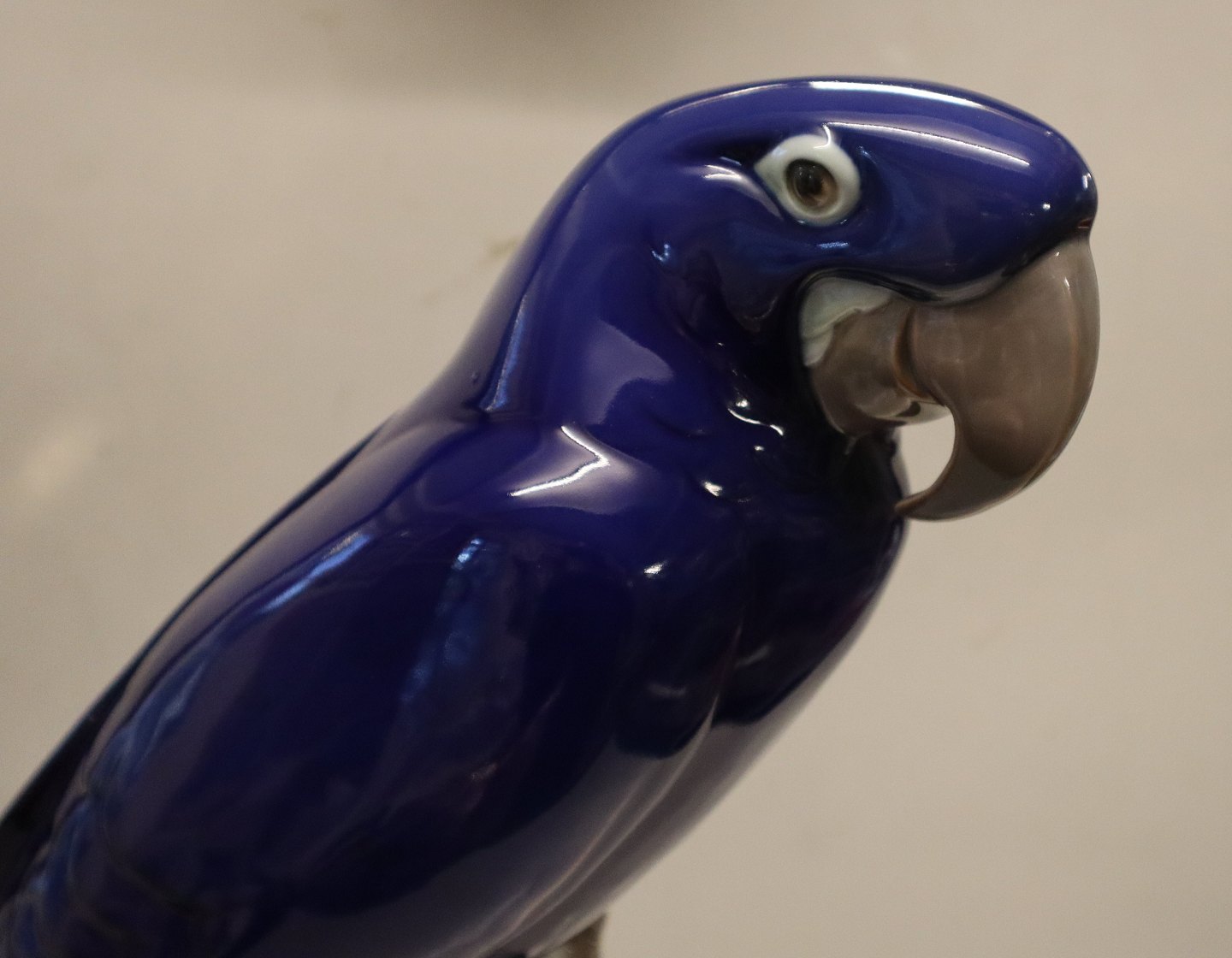 Beskrivelse: Kgl. figur fra Royal Copenhagen fugl 503 Blå Ara. Armand Petersen 41 cm (B&G 2235 ) Papegøjen blev først lavet hos Bing & Grøndahl 2. sortering I hel og fin stand