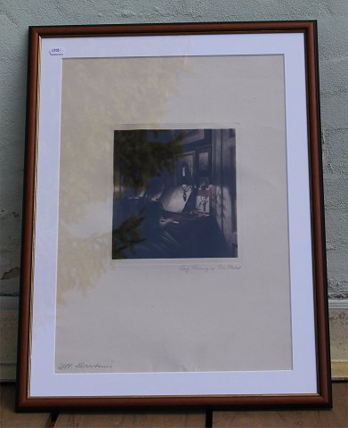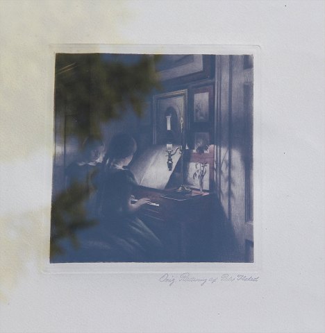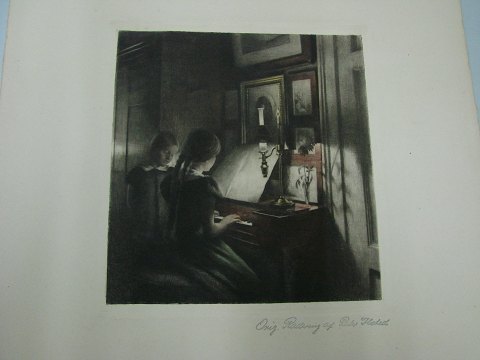Opus 47.  Aftenbillede. Piger ved spinettet - Klavertime 1904 Lysmål 23,5 x 21,5 cm Farvemezzotinte Signeret Original Radering af Peter Ilsted 2114 Samtidig ramme 41 x 37.5 cm Farveradering