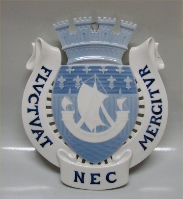 Beskrivelse: Bing & Grøndahl Byvåbenplatte B&G mindeplatte nr 12 1899 Paris' byvåben Fluctuat NEC Mergitur 25 cm Minimalt kanthak se billede. Blev brugt ved verdensudstillingen i Paris som pynt på standen