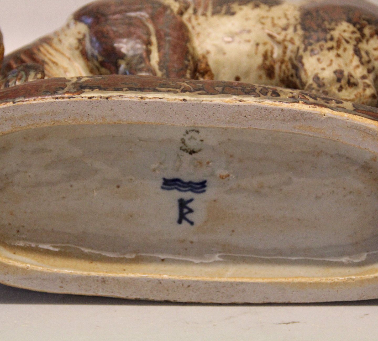 Beskrivelse: Royal Copenhagen stentøj 20553 Kgl Bøffel tyr af Knud Kyhn maj 1923 40 x 30 cm Signeret KK og tre blå bølgelinier