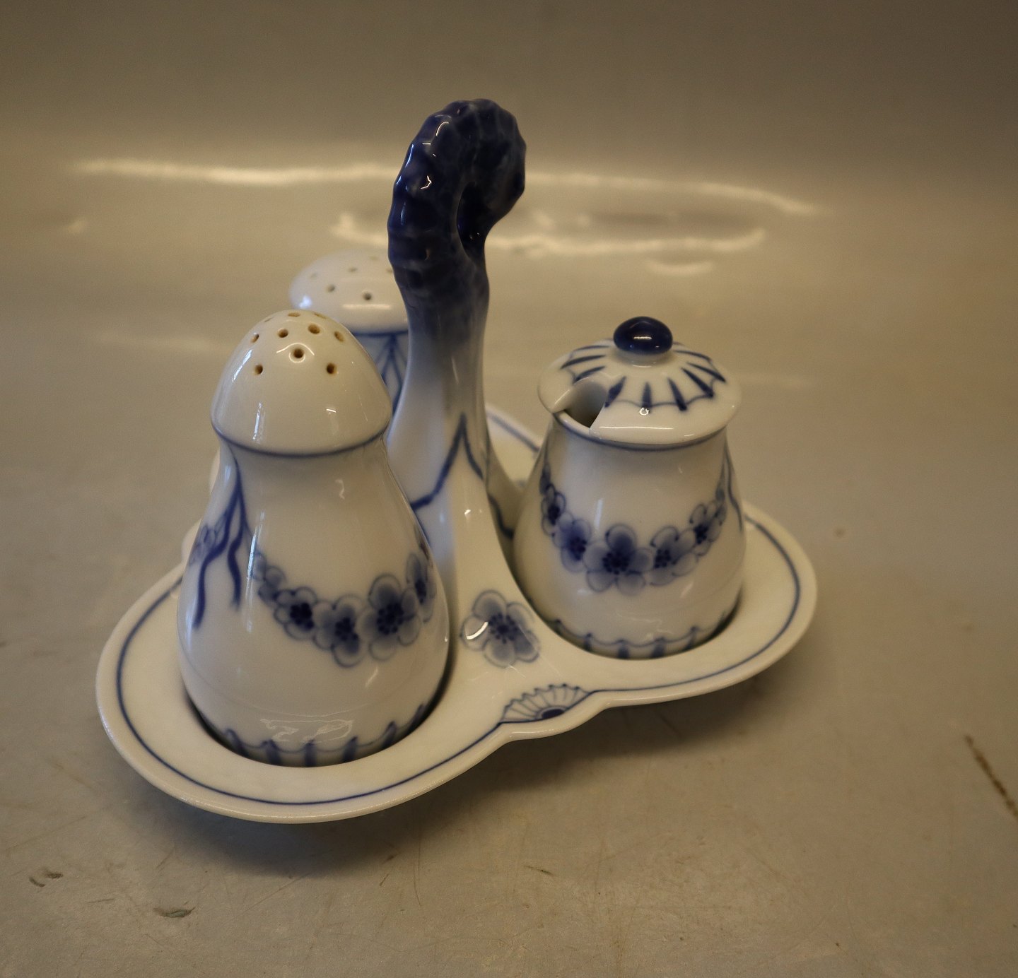 B&G Blå Empire porcelæn 052 Trekantet plat de menage med søhestehank inklusiv salt, peber og sennep