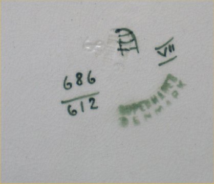 Beskrivelse: Aluminia fajance Julerelieffer. 686-612 Julerelief 1909 Maria Bebudelse R. Harboe 29,5 cm Julefest platter i kunststengods blev designet i skønvirke stil af Harald Slott-Møller, Rasmus Harboe og Nils Thorsson i perioden 19 04-19 30