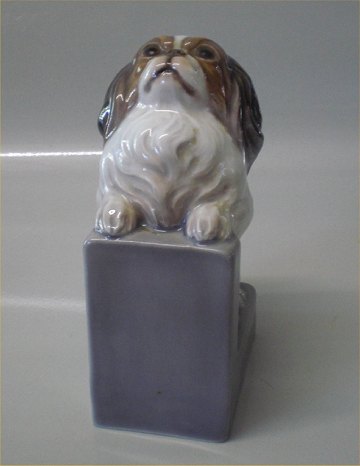 Beskrivelse: Dahl Jensenhund. 1109 Pekingeser bogstøtte 17 cm Mærket med kongelig krone og DJ Copenhagen i hel og fin stand.