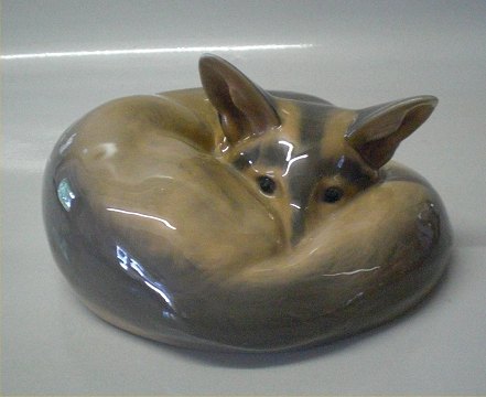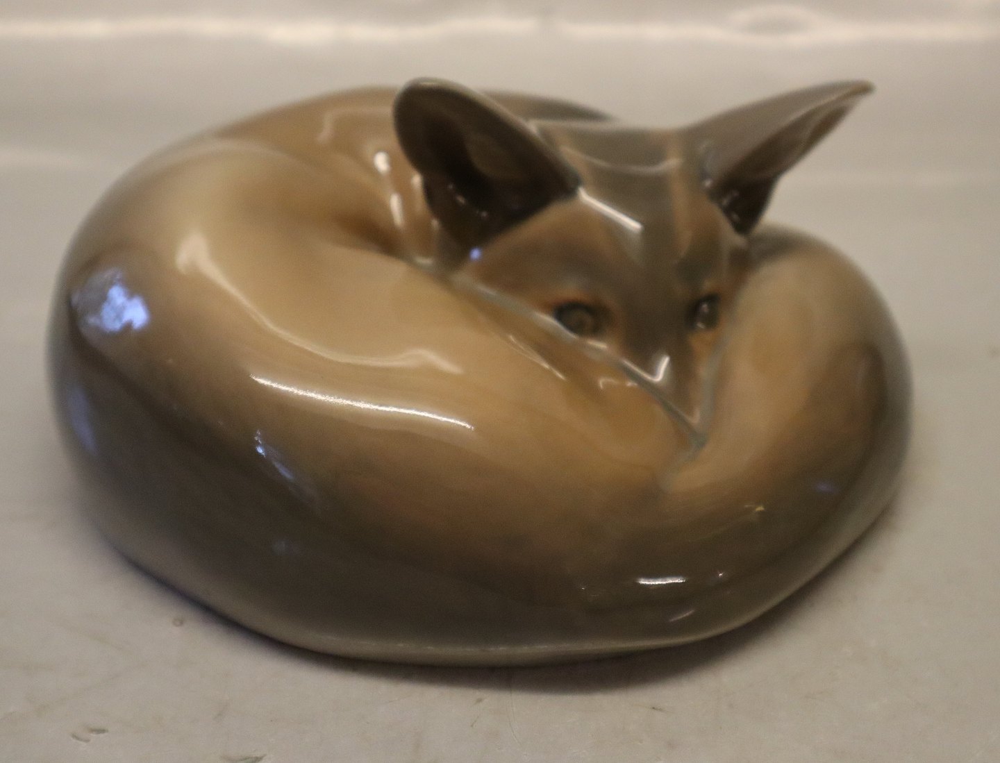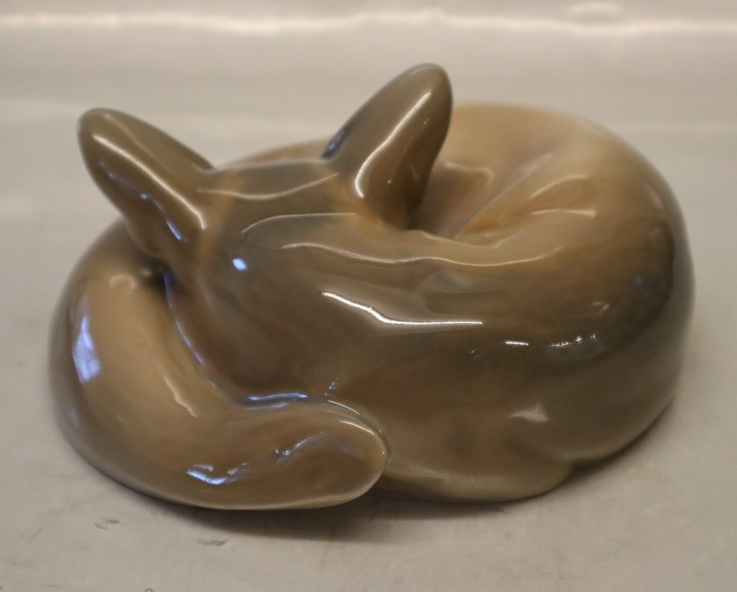 Beskrivelse: Kgl. figur fra Royal Copenhagen 0438 Kgl. Ræv - sammenrullet Erik Nielsen 1902 9 x 17 cm 1. sort I hel og fin stand