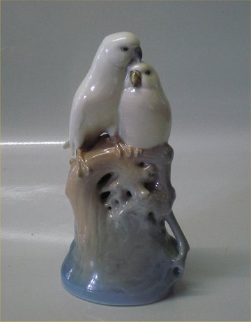 Beskrivelse: Kgl. figur fra Royal Copenhagen Dværgpapegøjer 0649 Kgl. Papegøjer på grene Theodor Madsen 1905 19 cm 1. sortering I hel og fin stand Lovebirds
