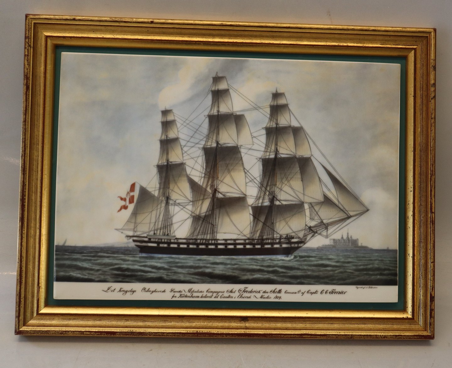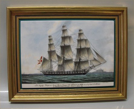 Beskrivelse: Bing & Grøndahl B&G Danske Skibsportrætter Jakob Petersen 1774 - 1855 nr. 1400 af 3500 Det Kongelige Octroyherede Danske Østasiatiske Compagnie Skib Frederik den Sjette Fra Kjøbenhavn bestemt til Canton i China Hartie 1829 Comand ds. af Capt G.G. Fronier 30,5 x 28,5 cm I fin og hel stand. Uden for Kronborg