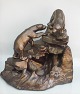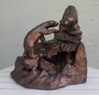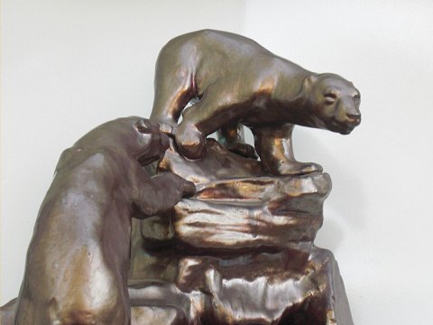 Beskrivelse: Kæmpe Bjørnegruppe rød kobberlustre glasur ca 40 x 40 cm Signeret SK Søren Kongstrand Kæmpe figur med to Isbjørne på klipper