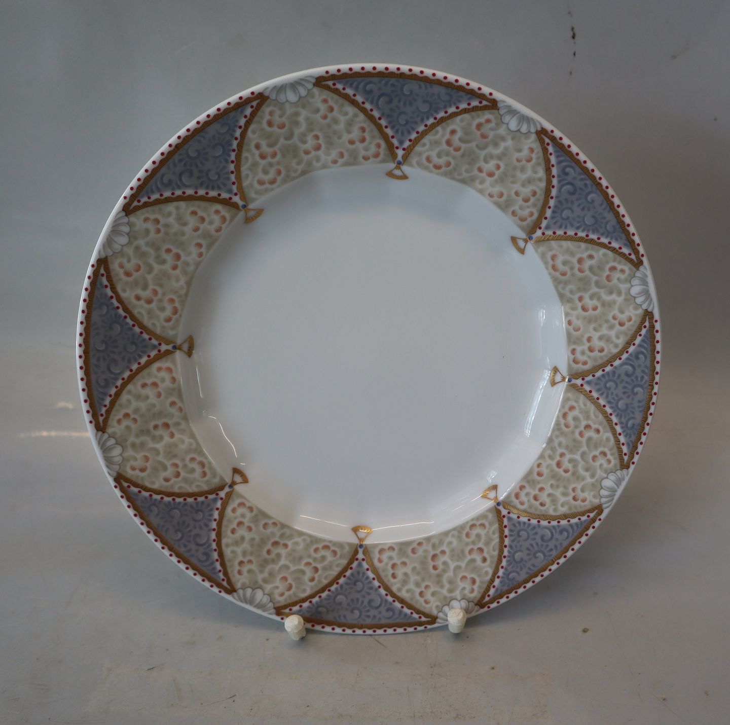 Grå 621 Frokosttallerkner 22,5 cm (8550) Royal Copenhagen Fairytale. Inspireret af Gerhard Hennings figurer af samme navn. Et kompleks flerfarvet transfer mønster på den kantede form som Blå Blomst Kantet. Design Finn Næss-Schmidt og Jørgen Nielsen. De grå dele har nummer 1201, terrakotta 1202 og serveringsdele med lidt af hvert 1203.