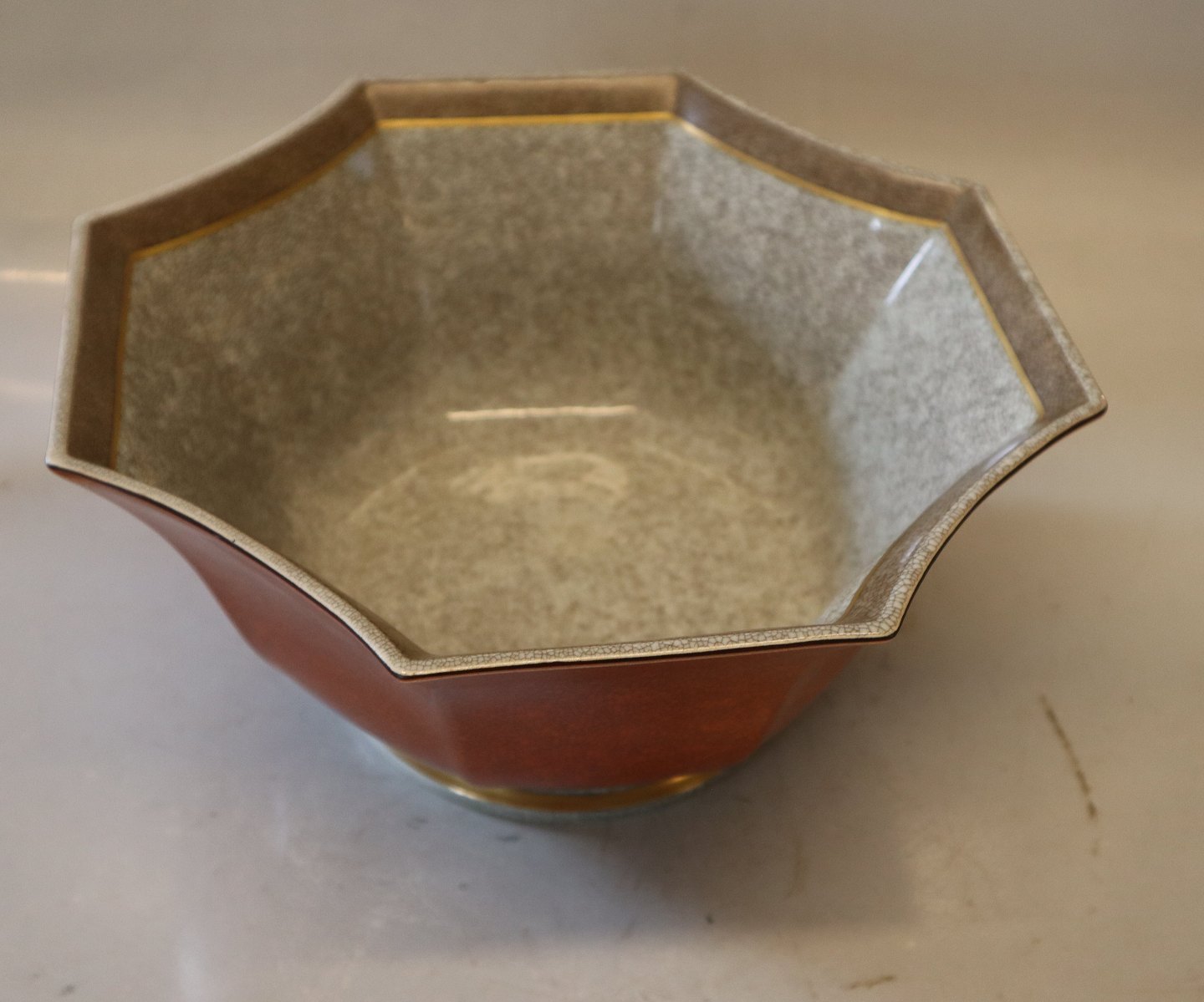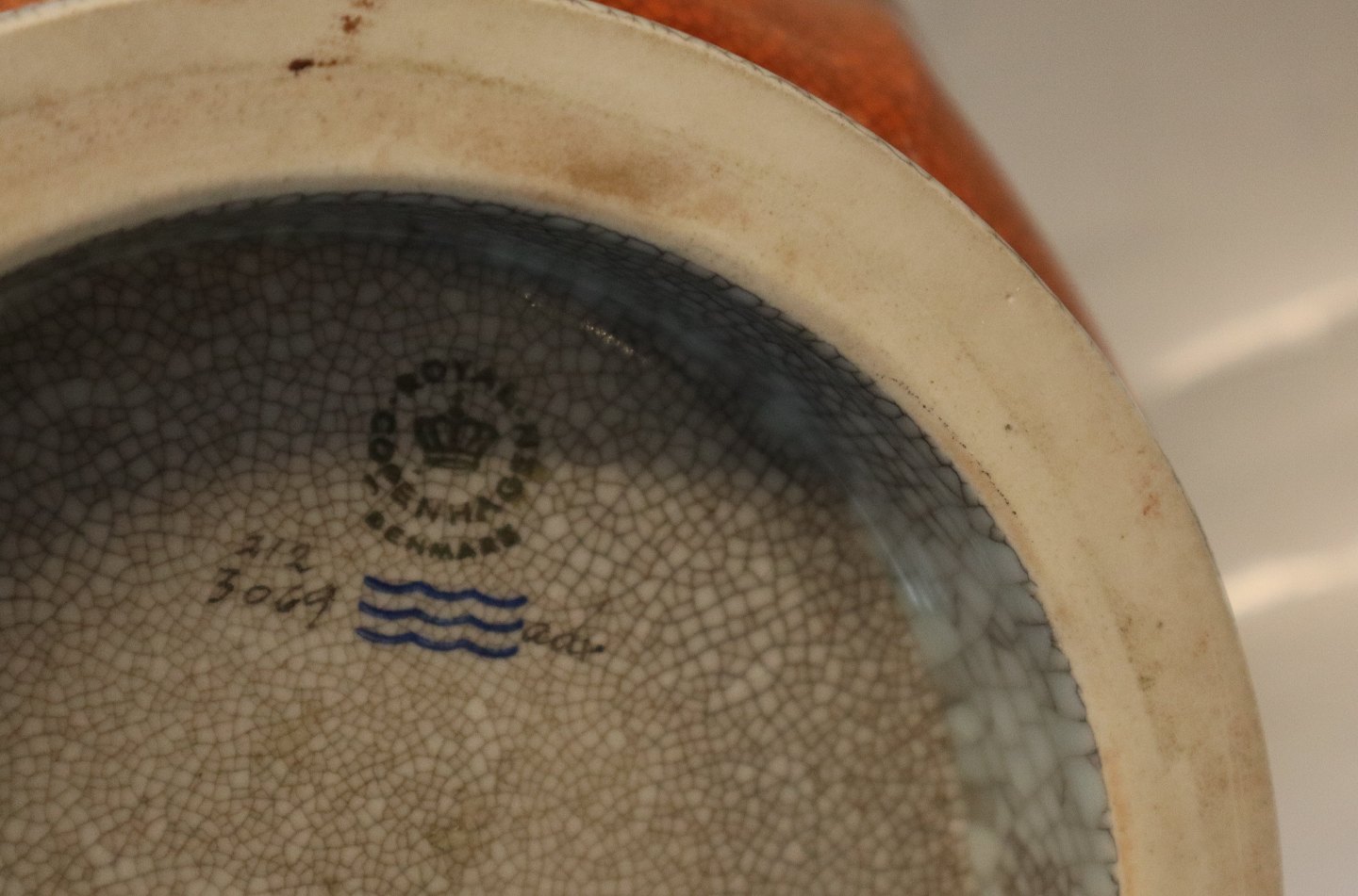Beskrivelse: 212-3069 Kgl. Orange skål med gråt og guld 13 x 28 cm Craquelé fra Royal Copenhagen I hel og fin stand