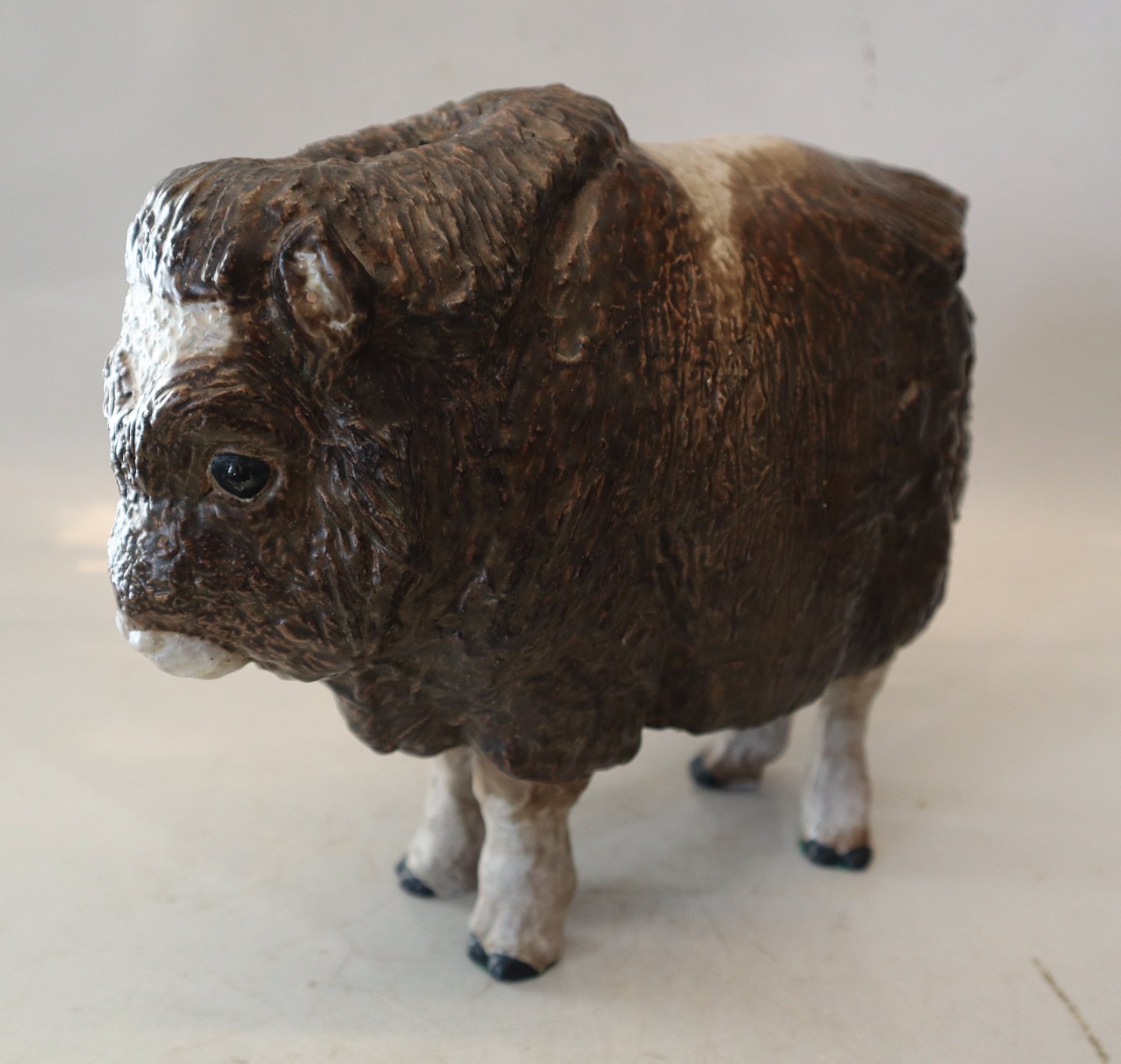 Beskrivelse: Royal Copenhagen Aluminia fajance 3149 Moskus Okse Jeanne Grut ca. 22 x 26 cm glaseret JG